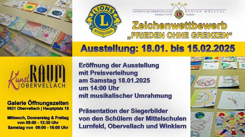 Beim Lions Friedensplakatwettbewerb zeichneten Schüler:innen zwischen 11 und 13 Jahren aus ganz Österreich Bilder zum Thema „Frieden ohne Grenzen“. Eine Jury krönte die besten Werke. Ziel des Friedensplakatwettbewerbes ist es, dass sich möglichst viele junge Menschen mit dem Thema Frieden auseinandersetzen und ihre Ideen kreativ auf ein Blatt Papier bringen. Kunst war, ist und wird immer ein Medium für Visionen einer besseren Welt sein. Die Lions möchten Jugendliche dazu motivieren, sich aktiv mit dem Frieden auseinanderzusetzen und ihre Hoffnungen und Ängste über ihre Zeichnungen mit der Welt zu teilen.