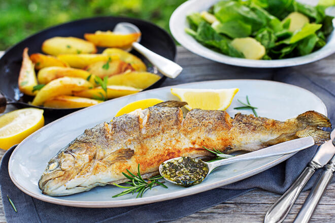 Forelle und Saibling auf verschiedene Arten zubereitet: Im Ganzen, filetiert, gebraten, gedämpft, kalt gebeizt, Räucherfischaufstrich, Fischlaibchen, ... dazu die passenden Beilagen