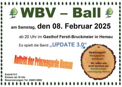 WBV-Ball 2025 mit Auftritt der Prinzengarde HemauEs spielt die Band "UPDATE 3.0"Gewinnspiel: HolzgewichtschätzenEinlass ab 19 UhrEintritt 9€Es lädt herzlich ein, die Waldbesitzervereinigung Hemau