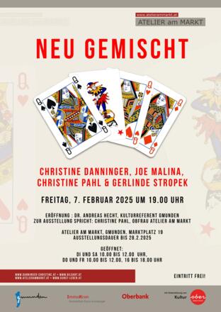 Das Kulturprogramm 2025 startet das Atelier am Markt am 7. Februar um 19.00 Uhr mit einer Vernissage unter dem Titel „Neu gemischt“. Mit Malerei und Fotografie stellen sich die Malerinnen Christine Danninger, Christine Pahl und Gerlinde Stropek, sowie der Fotograf und Kameramann Joe Malina vor. Kulturrefernet