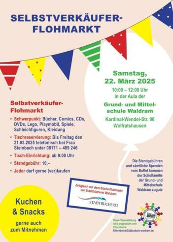 Selbstverkäuferflohmarkt zeitgleich mit dem Bücherflohmarkt der Stadtbücherei Waldram und leckerem Kuchenbuffet (auch zum Mitnehmen)