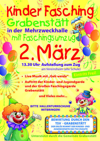 Kinderfasching in der Mehrzweckhalle in Grabenstätt. Der Eintritt ist frei - Live Musik mit "Geh weida" einen Auftritt der Kinder- und Jugendgarde und der Großen Faschingsgarde Grabenstätt. Habt bitte eure Hallenturnschuhe mit dabei. Die Bewirtung erfolgt durch den TSV Grabenstätt, alle Erlöse kommen der Kinder- und Jugendsparte des TSV zugute.