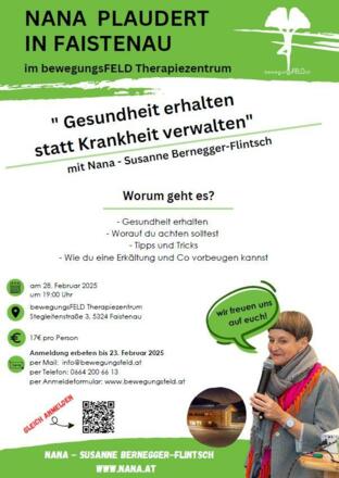 Susanne Bernegger-Flintsch, kurz Nana, spricht zum Thema Gesundheit und gibt Tipps und Tricks um Erkältung und Co vorzubeugen. Im BewegungsFELD, Kosten € 17,- pro Person, bitte anmelden.