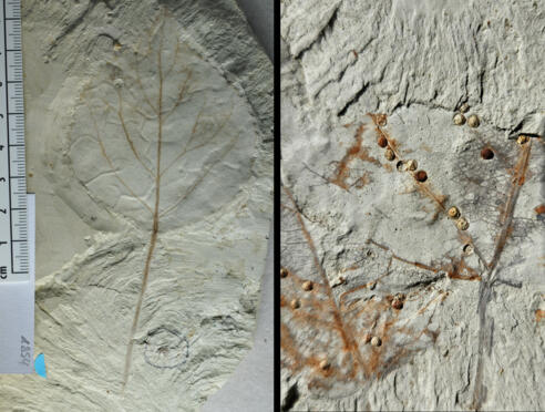 Bild 2: Ein fossiles Pappelblatt (links) und fossile Motten-Schildläuse (rechts)