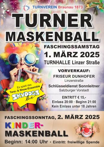 Am Faschingssonntag wird’s für alle kleinen Besucher bunt, denn der Turnverein Braunau lädt zum KINDERMASKENBALL ein.