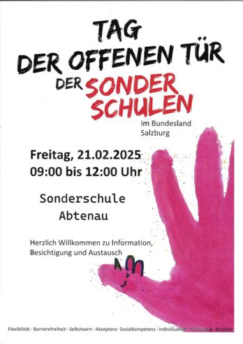 Die Sonderschule Abtenau lädt herzlich zum Tag der offenen Tür ein! Entdecken Sie unser vielfältiges Bildungsangebot, lernen Sie unser engagiertes Team kennen und erhalten Sie Einblicke in den Schulalltag. Wir freuen uns auf Ihren Besuch!