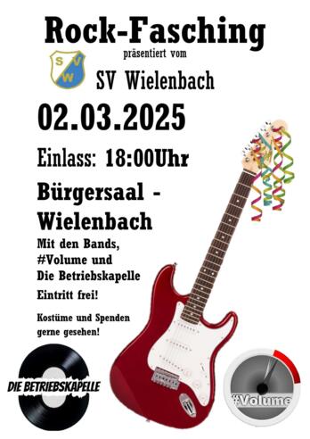 Faschingsveranstaltung des Sportvereins Wielenbach am Faschingssonntag im Anschluss an den Weilheimer Innenstadt-Fasching.Die Tanz-Veranstaltung findet im Bürgersaal Wielenbach mit den beiden Cover-Rockbands „#Volume“ aus Weilheim und „Die Betriebskapelle“ aus Peissenberg statt.