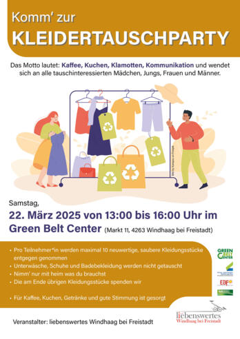 Komm' zur KLEIDERTAUSCHPARTY am Samstag, 22.03.2025 von 13:00 bis 16:00 Uhr im Green Belt Center