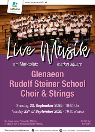 Die Glenaeon Rudolf Steiner School aus Australien ist mit ihrem beeindruckenden Chor & Streichorchester auf Europatournee – und macht Halt in Abtenau! Erleben Sie ein außergewöhnliches Konzert mit jungen Musikerinnen und Musikern, die klassische und moderne Werke mit großer Leidenschaft interpretieren.