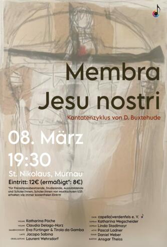 Zur Einstimmung auf die Fastenzeit findet am 08. März um 19:30 in der Pfarrkirche St. Nikolaus zu Murnau ein Konzert von capella|werdenfels statt: der Chor widmet sich in verkleinerter Besetzung dem Kantatenzyklus "Membra Jesu nostri" von Dietrich Buxtehude (1637-1707).
