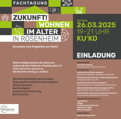 Podiumsdiskussion zu neuen Wegen - Wohnen im Alter in Rosenheim Wir dürfen namhafte Akteure als Diskussionsteilnehmer begrüßen. Sie sind herzlich eingeladen ihre Bedarfe und Wünsche aktiv miteinzubringen und freuen uns über eine rege Beteiligung.