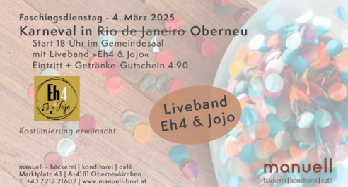 Start 18 Uhr im Gemeindesaal mit Liveband »Eh4 & Jojo«