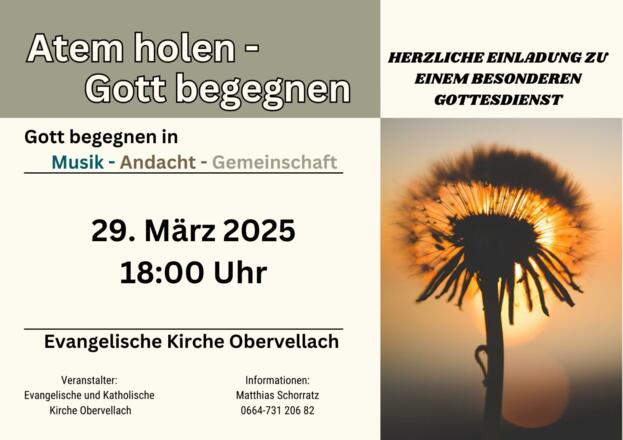 Einladung zum ökumenischen Gottesdienst "Atem holen - Gott begegnen" - Gott begegnen in Musik - Andacht & Gemeinschaft - in der evangelischen Kirche Obervellach.