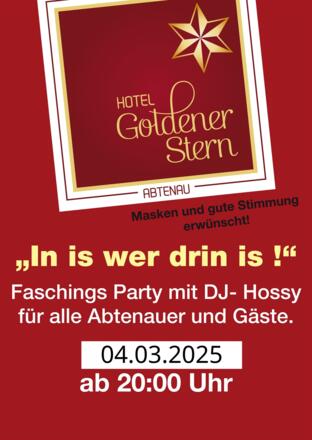"In is wer drin is !" - Tolle Faschings Party mit "DJ Hossy" für alle Abtenauer und Gäste. Masken und gute Stimmung erwünscht! Tel +43 6243 2240