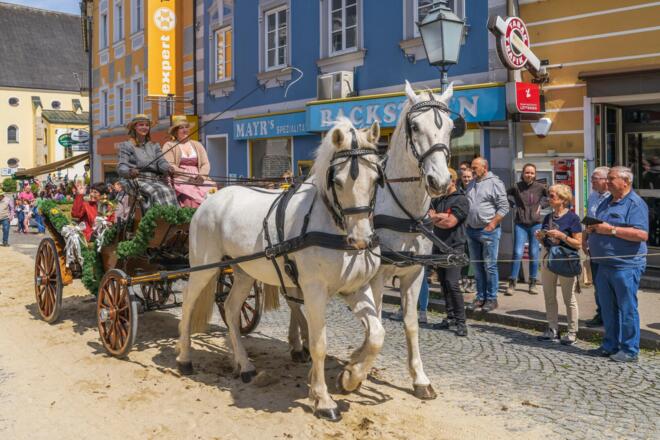 Die Preisverteilung findet um 14:00 Uhr am Kirchenplatz statt. Eröffnet wird mit einer Kutschenauffahrt und der Stefan-Fadinger-Bauerngruppe St. Agatha.