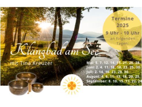 Bade in wohltuenden Klängen von Gongs, Klangschalen und weiteren Klangelementen in der wunderschönen Natur des Klingerparks in Seeboden am Millstätter See. Wir beginnen mit einer kurzen geführten Meditation zum Ankommen und lassen dann die heilsamen Schwingungen der verschiedenen Klänge auf uns wirken. Dabei kannst du dich entspannen und ganz in deine Mitte kommen. ZEIT FÜR DICH zum Entspannen, Auftanken und Wohlfühlen.