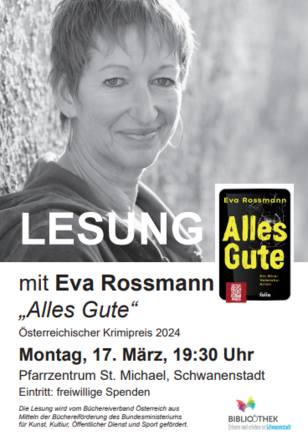 Die Öffentliche Bibliothek Schwanenstadt lädt am Montag, 17. März, zur Krimi-Lesung mit der Autorin Eva Rossmann um 19:30 im Pfarrzentrum St. Michael ein. Die Bestsellerautorin, bekannt für ihre Kriminalromane rund um die Ermittlerin Mira Valensky, wird ihr neuestes Werk „Alles Gute“ präsentieren, für das sie mit dem Österreichischen Krimipreis 2024 ausgezeichnet wurde.