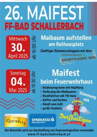 Musik „Die Dorfheiligen“, Kinderprogramm mit Hüpfburg, Verlosung des Maibaumes, Rundfahrten mit FW-Auto, Kaffee und Kuchen, Hendl vom Grill, große Tombola.