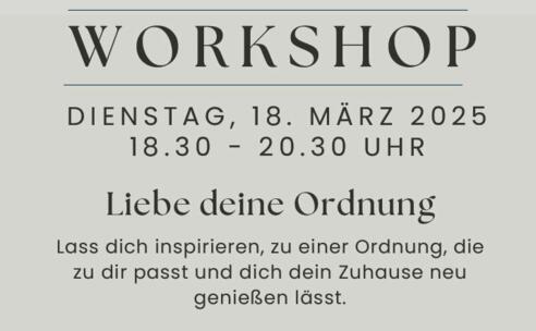 Du möchtest wissen wie unterschiedliche Ordnungstypen ticken und was für wen hilfreich ist? Mehr dazu sowie praktische Tipps für deine Ordnung im Alltag gibt es im Workshop „Liebe deine Ordnung“. Denn es geht um viel mehr als einfach nur Aufräumen! Die zertifizierte Ordnungscoachin beantwortet deine Fragen und bietet Anregungen für deine brennendsten Ordnungsherausforderungen.