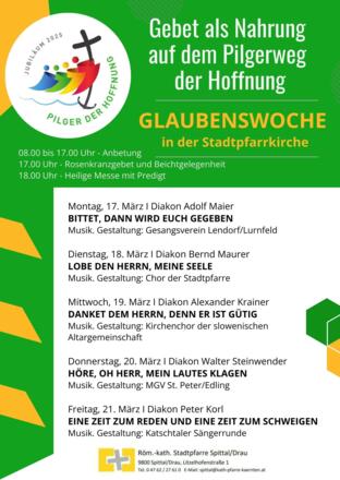 In der Spittaler Stadtpfarrkirche findet die Glaubenswoche unter dem Thema "Gebet als Nahrung auf dem Pilgerweg der Hoffnung" vom 17. bis 21.03.2025 statt.