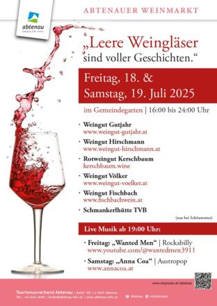 Der Tourismusverband hat sich mit den Weinhändlern der Abtenauer Gastronomie zusammengetan und veranstaltet den dritten Abtenauer Weinmarkt. Genießen Sie einen gemütlichen Abend bei einem guten Gläschen Wein und Livemusik.