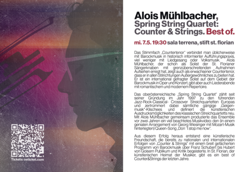 Aus diesem Erfolg heraus entstand eine künsterlische Freundschaft, die bereits zu nationalen und internationalen Erfolgen von "Counter & Strings" mit einem breit gefächerten Programm von Barockmusik über Franz Schubert bis Hubert von Goisern Publikum und Kritik begeisterte. In St. Florian, der künstlerischen Heimat der Musiker, gibt es ein best of Counter&Stings der letzten Jahre.