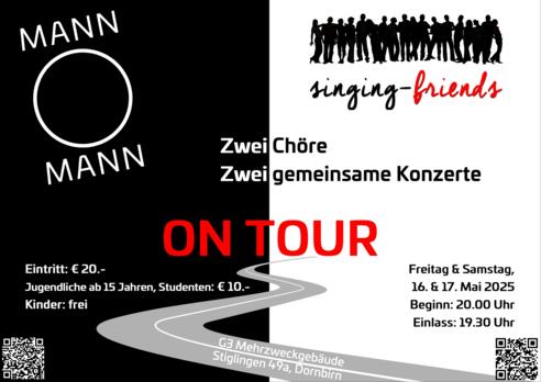 Am 16. und 17. Mai 2025 um jeweils 20:00 Uhr findet im G3 Mehrzweckgebäude ein Gemeinschaftskonzert des Männerchors “MANN O MANN” und der “singing-friends” statt. Zwei Chöre. Zwei Konzerte. Wir gehen auf Tour und bieten ein abwechslungsreiches Programm und einen unvergesslichen Abend mit uns. Der Kartenvorverkauf wird über die jeweilige Homepage des Chores, oder die Chormitglieder selbst, möglich sein.