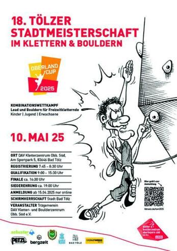 Am 10.05.2025 findet die 18. Tölzer Stadtmeisterschaft im Klettern und Bouldern statt. Das Event wird im DAV Kletter- und Boulderzentrum Bad Tölz ausgetragen und ist Teil des bekannten Oberlandcups.Registrierung: 07:45 Uhr - 08:30 UhrQualifikation: 09:00 Uhr - 15:30 UhrSiegerehrung ca. 19:00 UhrAnmeldung ab 15.04.2025 nur onlineVeranstalter: Trägerverein DAV Kletter- und Boulderzentrum Obb. Süd e.V. Weitere Informationen finden Sie unter https://www.kbtoelz.de/tsm2025/