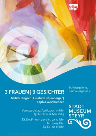 Die nächste Ausstellung in der Schlossgalerie Steyr zeigt Werke von drei Niederösterreicherinnen, nämlich Melitta Progsch, Elisabeth Rosenberger und Sophia Weinbrenner. Eine abstrakte Acrymalerin, eine moderne Aquarellistin und eine realistische Malerin im Großformat bespielen die Räumlichkeiten nicht nur mit der Ausstellung. Die Künstlerinnen freuen sich auf viele neue und vertraute Gesichter bei der Vernissage am 22.04.2025, um 19 Uhr. Es begrüßt StRin Abg. z. NR Mag.a Katrin Auer. Zur Ausstellung spricht Expertin Marlene Steinz. Ein Highlight ist eine musikalische Einlage der preisgekrönten Liedermacherin Sigrid Horn.