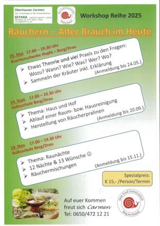 Carmen Oberhauser, FNL-Kräuterfachfrau führt auf gekonnt professionelle Art und Weise in dieses Alte Brauchtum ein. Nach der Einführung in die Theorie werden Fragen zu Wozu? Wann? Wie? Was? Wer? Wo? beantwortet, Kräuter gesammelt und deren Wirkung beim Räuchern besprochen.