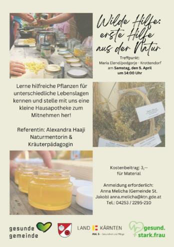 Am 05. April 2025 findet in Maria Elend, ab 14:00 Uhr, der Workshop “Wilde Hilfe: Erste Hilfe aus der Natur” statt.
