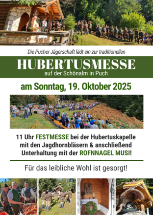 Die Pucher Jägerschaft veranstaltet jährlich am 3. Sonntag im Oktober die Hubertusmesse auf der Schönalm. Die Bergmesse wird feierlich von der Jagdhornbläsergruppe Puch-Oberalm umrahmt.