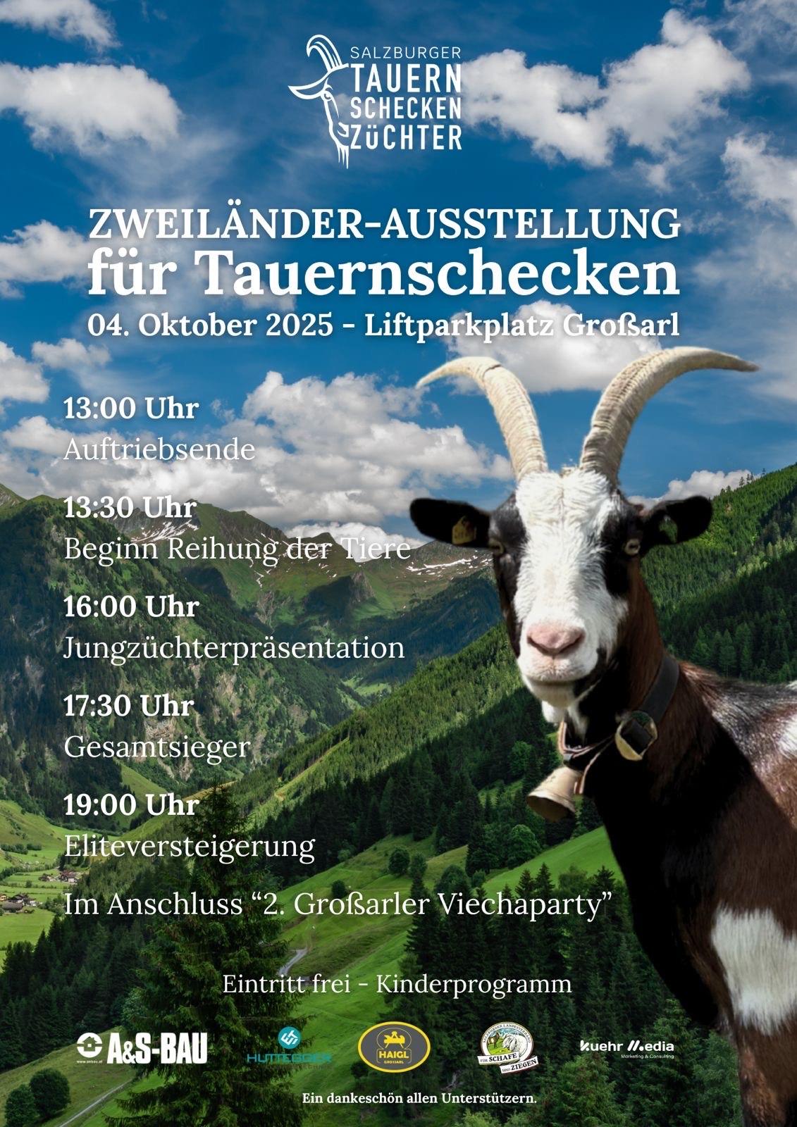 Die Zweiländer-Ausstellung für Tauernschecken beginnt um 13.00 Uhr mit dem Auftrieb der Tiere, gefolgt von der Reihung, bei der Zuchtexperten die Qualität der Tiere bewerten. Um 16.00 Uhr findet die Jungzüchterpräsentation statt und um 17.30 Uhr wird der Gesamtsieger gekürt. Eine Eliteversteigerung startet um 19.00 Uhr, bei der die besten Tiere zum Verkauf angeboten werden. Im Anschluss sorgt die "2. Großarler Viechaparty" mit musikalischer Unterhaltung durch "Die Sunnseitna" für einen stimmungsvollen Ausklang. Der Eintritt ist frei, es gibt auch ein tolles Kinderprogramm. Auf Ihr Kommen freuen sich die Rossbauern aus dem Großarltal. Freier Eintritt!