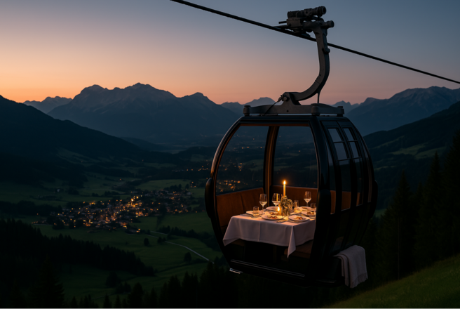 - Preis pro Person € 98,– inkl. Menü, alle Getränke in der Gondel, die Seilbahnfahrt und ein Glas Prosecco zum Empfang.
