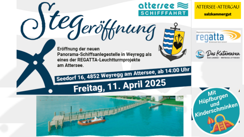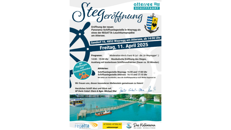 Schiffsanlegestelle Attersee: 16:15 und 17:15 UhrWir bitten um Verständnis, dass die Schiffskapazität je nach Wetter begrenzt ist.Wir freuen uns, diesen besonderen Meilenstein gemeinsam zu feiern!