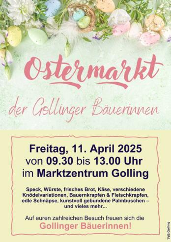 Es werden zahlreiche Produkte wie Speck, Würste, Brot, Fleischkrapfen, Eier, Käse, Topfen, Palmbuschen, Osterdekorationen, verschiedenes Ostergebäck und vieles mehr angeboten. Die Gollinger Bäuerinnen freuen sich auf Ihren Besuch!