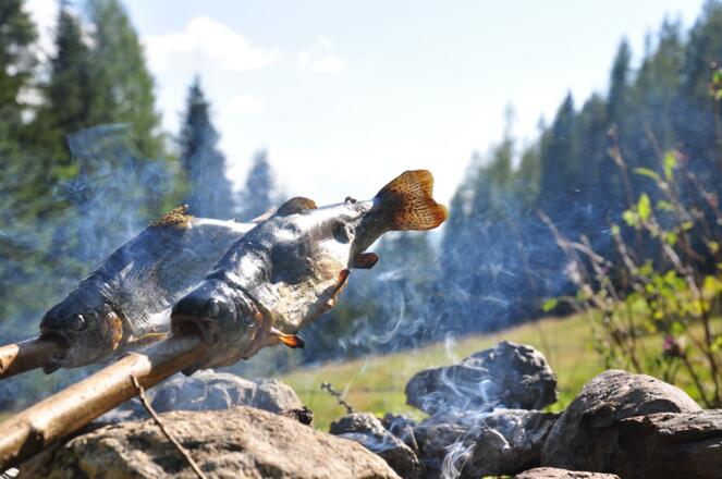 Zubereitung des selbstgefangenen Fisches und braten am offenem Feuer