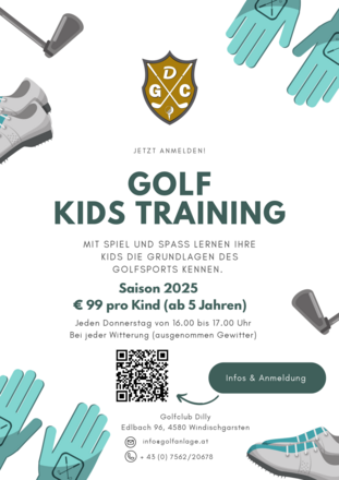 Lassen Sie Ihre Kinder spielerisch die Grundlagen des Golfsports entdecken! Beim Golf Kids Training lernen junge Golfer:innen ab 5 Jahren jeden Donnerstag von 16:00 bis 17:00 Uhr die Faszination des Spiels kennen – bei jeder Witterung (außer Gewitter).