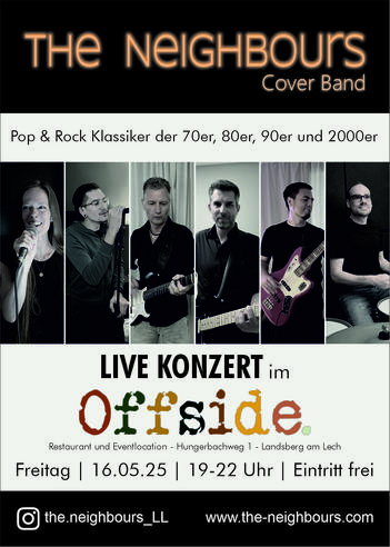 Die Landsberger Cover Band „The Neighbours“ spielt ab 19 Uhr bekannte Pop und Rock Klassiker der 70er, 80er, 90er und 2000er Jahre. Die sechs MusikerInnen stehen für ehrliche, handgemachte Pop- und Rockmusik, 2-stimmigen Gesang und kraftvolle Gitarrensounds. Mitsingen, Mittanzen, Mitfeiern - alles ist ausdrücklich erlaubt!