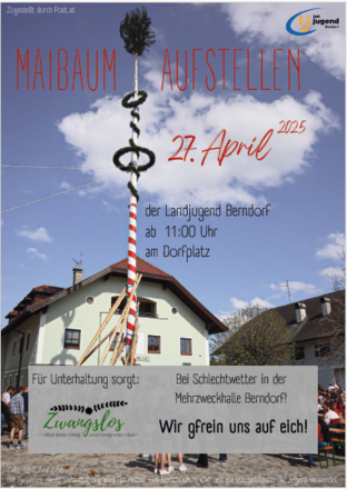 Die Landjugend Berndorf lädt zum Maibaum Aufstellen ab 11:00 Uhr am neu gestalteten Dorfplatz Berndorf ein. Die Veranstaltung findet bei jeder Witterung statt. Für Unterhaltung und das leiblich Wohl ist gesorgt! Eintritt frei.