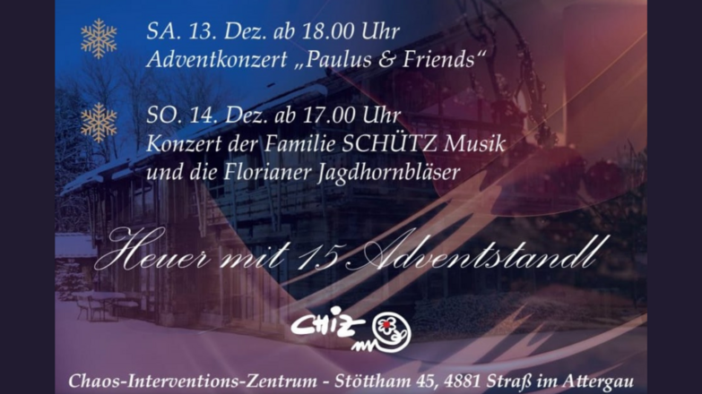 Der "Stötthamer Advent", organisiert vom bekanntesten österreichischen Mundmaler Paulus Ploier und seiner Frau Monika in dessen Chaos-Interventions-Zentrum (CHIZ) in Straß im Attergau (Stöttham 45) findet alle zwei Jahre statt. Diesmal am Samstag, dem 13. und Sonntag, dem 14. Dezember, täglich ab 15 Uhr bis open end. Und diesmal noch größer, diesmal noch mehr Programm, diesmal noch mehr Abwechslung, diesmal mit circa 16 Adventstandln und einem Programm für die Kinder. Paulus und Monika Ploier laden dazu nicht nur die gesamte Bevölkerung der Region, sondern natürlich auch alle Gäste aus nah und fern ein und freuen sich auf viele Besucher/innen.
