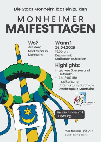 Maifest am Monheimer MarktplatzDie Stadt Monheim veranstaltet - unter der Führung der Kolpingsfamilie Monheim zusammen mit der Stadtkapelle und der Wasserwacht Monheim - das Maifest am Monheimer Marktplatz, zu dem alle Bürgerinnen und Bürger hiermit herzlich eingeladen sind.Am Samstag, den 26. April 2025 wird ab 15.00 Uhr der Maibaum aufgestellt.
