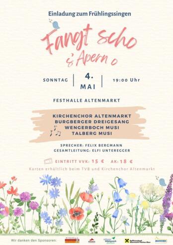 „Fangt scho s’Apern o“ – unter diesem Motto findet am Sonntag, den 4. Mai 2025, das diesjährige Frühlingssingen vom Kirchenchor Altenmarkt in der Festhalle Altenmarkt statt. Beginn ist um 19:00 Uhr.