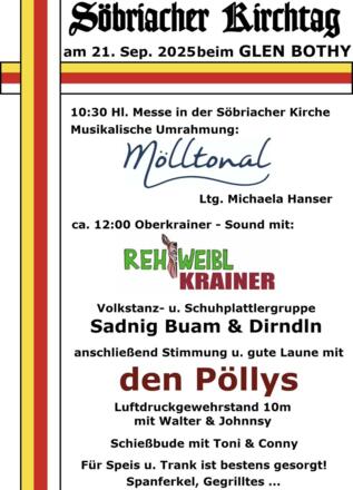 Einladung zum Söbriacher Kirchtag mit Gottesdienst in der Söbriacher Kirche und anschl. Unterhaltung mit den "Rehweibl Krainer" und den "Pöllys" beim Glen Botyh.
