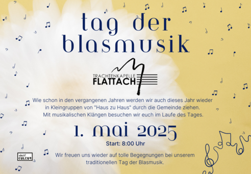 Am Tag der Blasmusik zieht die Trachtenkapelle Flattach in verschiedenen Kleingruppen mit musikalischen Klängen von "Haus zu "Haus" durch die Gemeinde Flattach. Start ist um 08:00 Uhr.