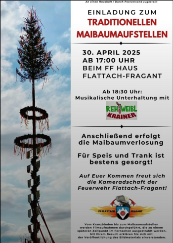 Die Freiwillige Feuerwehr Flattach-Fragant ladet zum traditionellen Maibaumaufstellen ein. Empfang des Maibaumes ab ca. 17:00 Uhr. Musikalische Unterhaltung mit Rehweibl Krainer. Anschließend erfolgt die Maibaumverlosung. Für Speis und Trank ist gesorgt.