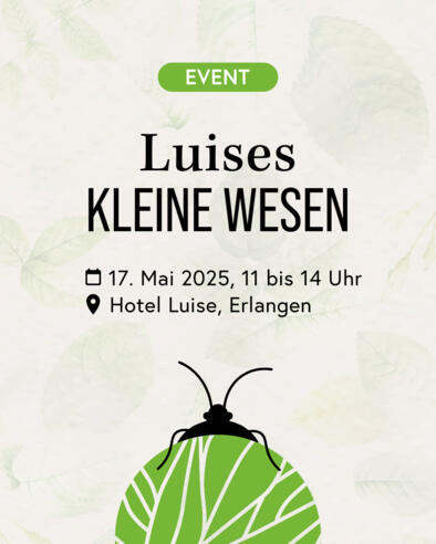 Am 17. Mai nehmen wir euch im Hotel Luise gemeinsam mit Beyond Content, Climate Connect und dem botanischen Garten Erlangen mit in die Welt der kleinen Wesen. Freut euch auf spannende Vorträge zur Biodiversität, eine Ausstellung rund um die Insektenwelt, Austausch mit Expert*innen und vieles mehr.