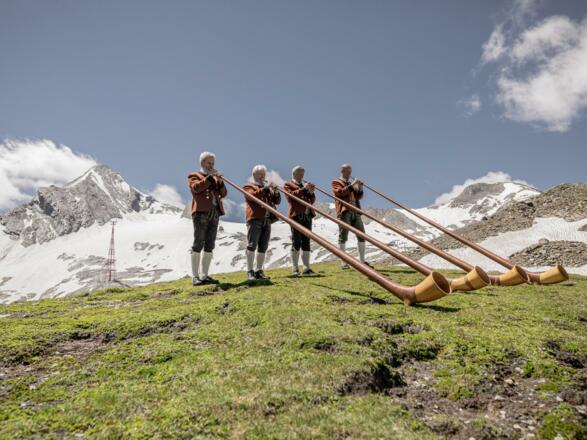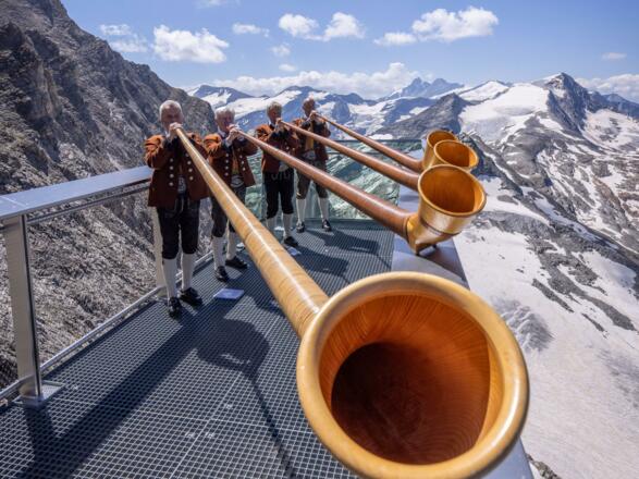 Um 14:00 Uhr kommen alle Alphorngruppen auf der Terrasse zusammen, um den Tag mit Gipfel Klängen gebührend ausklingen zu lassen.