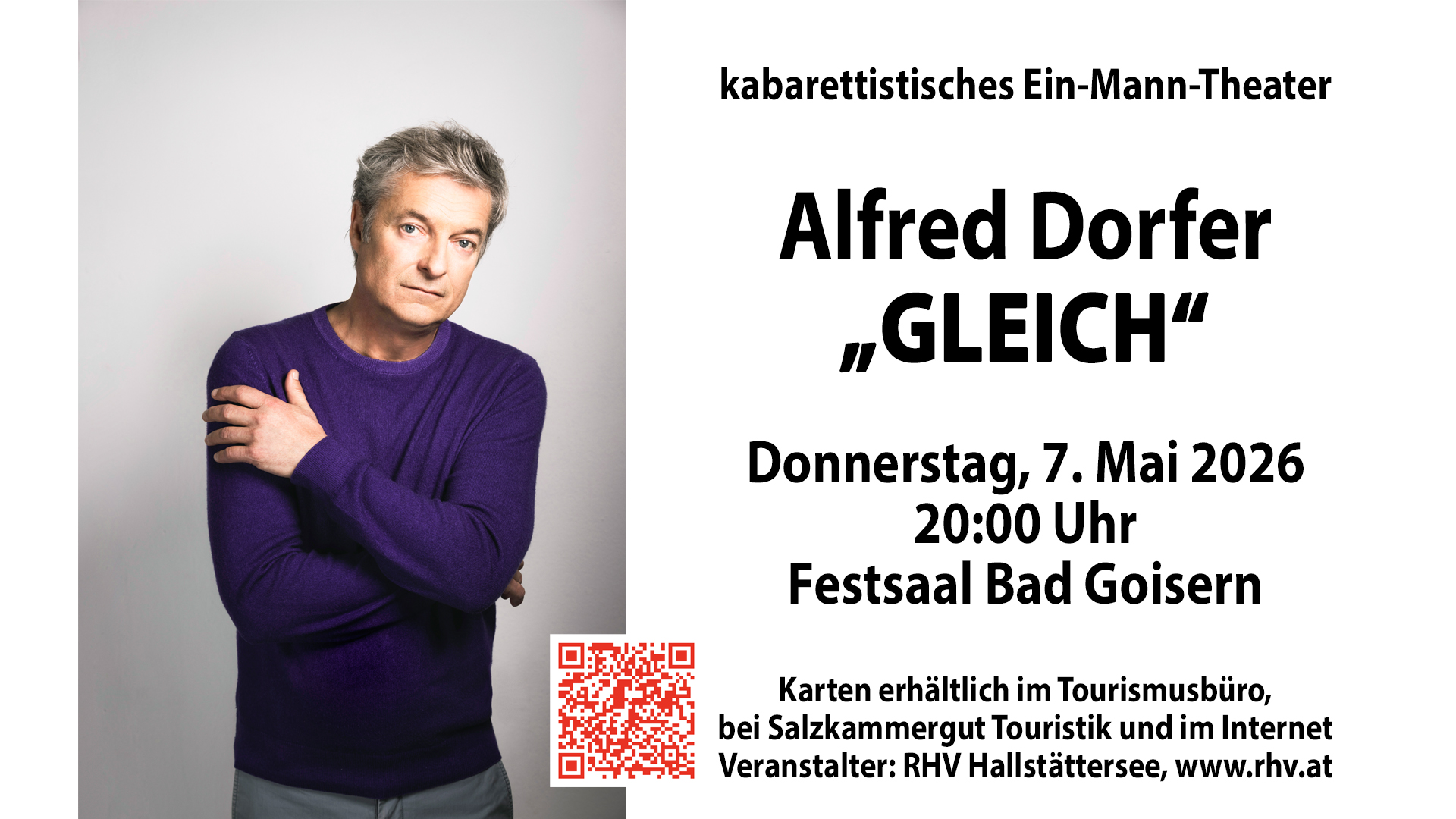 Bären, Karpfen, Sonnenblumen oder Großmütter – in seinem neuen Solostück „GLEICH“ bringt der legendäre Gedankenturner Alfred Dorfer all diese Figuren auf die Bühne. Mit einem rasanten Wechsel zwischen skurrilen Charakteren und zeitlichen sowie erzählerischen Exkursen entwirft Dorfer eine Geschichte, die weit über reine Unterhaltung hinausgeht.