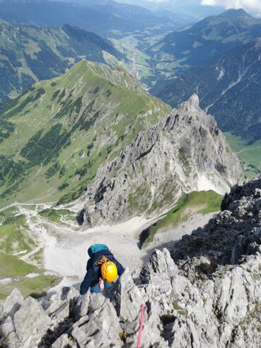 Ein erfahrener Guide begleitet die Gruppe über den markanten Felsgrat bis zum Gipfel des Widderstein – ein Erlebnis für alle, die den Nervenkitzel alpiner Grattouren lieben und dabei sicher unterwegs sein möchten.